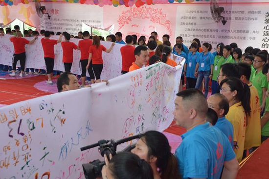 為期一天的活動內容豐富多彩,從獨特的“打招呼”到有趣的“Bingo游戲”、呼啦圈;從激情的“拼圖”到感人的“兩人對話”;從簡單的“風中勁草”到極富挑戰的“信任倒”,到“百米畫卷”和“愛的嘉許”等,一系列的體驗式活動讓家長、老師、學生們一掃平日的拘謹,打開心扉積極參與。他們相互述說、傾聽,相互鼓勵、信任,增進了彼此的溝通交流。情到深處,汗水、淚水夾雜在一起,很多老師、家長、義工和孩子們相擁而泣。真誠、合作、信任、感恩等積極情緒感染了現場每一個人,“三一三一,永爭第一”的加油聲此起彼伏。