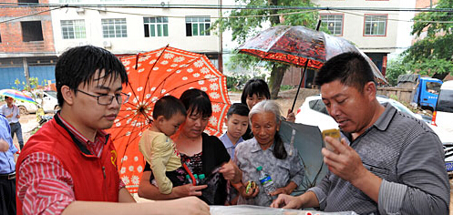 21日,寧都縣干部和志愿者在固村鎮災區向村民發放水和干糧 記者李湖明攝