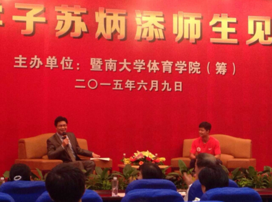 【香港商報網訊】6月9日,在暨南大學曾憲梓科學館國際會議廳舉行了暨南學子蘇炳添師生見面會。“亞洲第一人”蘇炳添與400多名暨大師生進行了對話。2015年國際田聯鉆石聯賽美國尤金站男子100米比賽中,中國選手蘇炳添以9.99秒獲得第三名,成為首個跑進10秒大關的黃種人,也是真正意義上第一位進入9秒關口的亞洲本土選手。記者獲悉蘇炳添本次專程回廣州,是為參加廣東省第九屆大學生運動會4*100接力賽。
