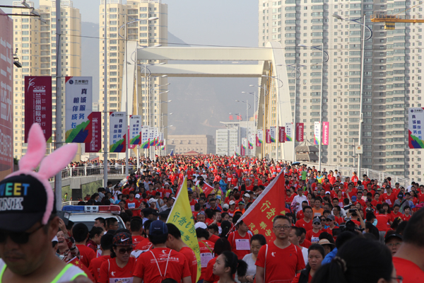 2015蘭州國際馬拉松賽上午7時30分正式鳴槍開跑,共有來自21個國家和地區的40029名馬拉松選手和馬拉松愛好者參加。