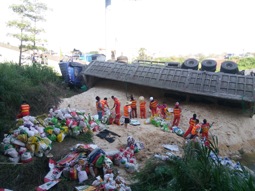 清晨4:35,記者趕到現場發現,坍塌的匝道位於一條小河上方,約130米受損匝道中,有70多米已完全崩塌,斷裂坍塌的匝道呈傾斜的45度角橫亙在小河及岸邊,堵住了小路。發生事故共有四輛貨車,其中三兩側翻在路邊,一輛側翻在路中間,車廂中的黃白色瓷土翻灑了一大半。