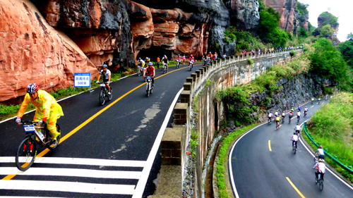 山地车爱好者在齐云山丹霞地貌间的旅游公路上奋力爬坡