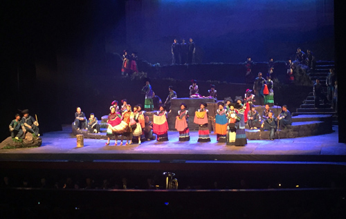 據介紹,《彝紅》由四川涼山彝族自治州歌舞團和涼山文廣傳媒集團出品,涼山歌舞團、五彩涼山藝術團完成演唱和表演,涼山交響樂團伴奏,大涼山合唱團擔綱合唱,近230人的演出團隊除了兩個特邀演員外,全部是涼山本土演員,80%以上為彝族演員。滄桑質樸的彝語清唱、婉轉悠揚的月琴彈奏,《彝紅》將“彝海結盟”通過虛構的小人物——彝族姑娘妮紮嫫、紅軍戰士天紅以及彝族小夥拉鐵三人之間的親情、友情、愛情的故事來呈現,舞台上的涼山當地民族元素極具感染力,整部歌劇豐富而飽滿,動人的情感故事貫穿其中,把紅色主題與彝族優美的音樂舞蹈、民風民俗結合在一起。