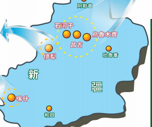 新疆將建設「絲綢之路經濟帶」向西出口制造業基地。瞄準中亞、西亞、南亞等周邊國際市場,積極承接東部產業梯度轉移,科學布局、加快建設七大加工制造業出口基地。一是機械裝備工業基地,形成可再生能源裝備、輸變電裝備等產業集群;二是輕工產品出口基地,重點建設食品產業體系;三是紡織服裝產品出口基地,使新疆成為中國西部最具影響力的服裝生產基地和向西出口的集散中心;四是建材產品出口加工基地,發展傳統建材、化學建材和金屬建材等產品;五是化工產品出口基地,抓好大型煉油、乙烯等生產,使新疆成為國家重要的石油天然氣生產加工基地;六是金屬制品出口加工基地,綜合開發利用各類金屬礦產資源,形成鋼鐵、電解鋁等冶金工業體系;七是加工貿易基地,拓寬優勢資源轉換戰略的實施空間。