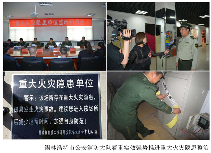四、全面曝光隱患,充分利用社會輿論促進整治。錫市大隊充分利用媒體宣傳優勢,在盟、市兩級主流媒體曝光重大火災隱患單位情況,通過輿論推動火災隱患整治工作的開展。1月19日,錫市公安消防大隊抽調監督人員聯合錫林郭勒盟電視台、錫林郭勒盟廣播電台、錫林郭勒晚報三家主流媒體再次行動,對嚴重影響公共安全、整改進度緩慢的重大火災隱患單位龍城購物廣場進行隱患曝光。錫市公安消防大隊同時提醒廣大市民,龍城購物廣場存在重大火災隱患,極易發生火災事故。建議廣大市民進入該場所後減少逗留時間,加強自身防范。在曆時5個多月的火災隱患整改後,該單位對重大火災隱患整改完畢並摘牌銷。6月4日20時00分整,錫林郭勒廣播電視台一套《聚焦民生》欄目將播出了錫市政府掛牌督辦重大火災隱患單位龍城購物廣場摘牌銷案的新聞。