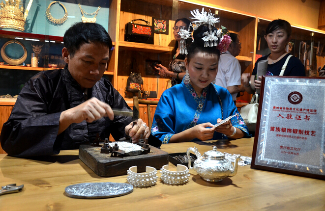 記者在展館內看見,兩萬多平方米的展區內,非遺展品豐富多彩,各種活動精彩紛呈,亮點多多。侗族大歌、苗族服飾、苗族史詩《亞魯王》、丹寨古法造紙和茅臺酒釀制技藝等數百項貴州非物質文化遺產,讓參觀者感受原汁原味的貴州文化。省內外200余家文化創意企業重點展示銀飾、蠟染、刺繡、3D打印、包裝設計等文化創意作品,以及本土生態農特產品等,并現場交流、學習。