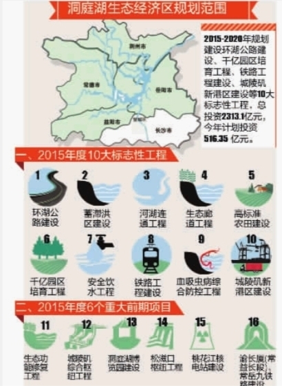 根據計劃,2015年洞庭湖生態經濟區建設將推進生態功能修復工程、桃花江核電站建設、城陵磯綜合樞紐工程、洞庭湖博覽園建設、松滋口樞紐工程、渝長廈(常益長段)、常岳九鐵路建設等6個重大項目前期工作。其中:
