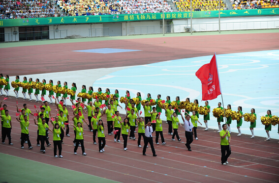開幕式上,運動員代表、裁判員代表進行了宣誓,社會體育指導員宣讀了《全民健身倡議書》。伴隨著激蕩樂曲,省九運會在以“綠色貴州.生命暢想”為主題的文體展演中拉開帷幕,《如夢如幻》、《林城曙光》、《云俯黔山》、《全“球”運動》、《吉鳥還巢》,5個篇章的演出,生動演繹了貴州生機勃勃的發展態勢和貴州人民運動不止的積極態度。