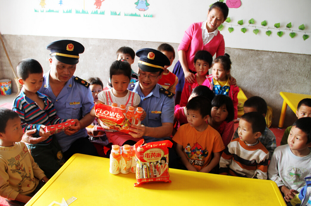 江西 “工商叔叔”教孩子們辨別“問題食品”.