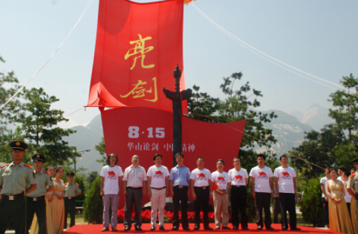 【香港商報訊】記者夏星報道: 8月15日上午,陜西華山腳下,豎起了“一把凝聚愛國精神的民族之劍”——亮劍雕塑。華山論劍西鳳酒攜手華商報、香港紫荊雜志、華山景區管委會、華山旅游集團有限公司聯合舉辦的“華山論劍 中國精神”紀念抗戰勝利70周年暨亮劍雕塑揭幕儀式在華山景區中心生態廣場拉開帷幕,本報副總編張介嶺應邀隨香港媒體采訪團參加了本次活動。