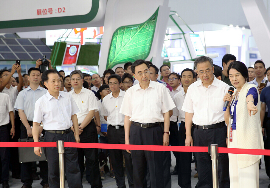 董明珠(前右一)给广东省委书记胡春华(前右二)、省长朱小丹(前右三)、珠海市委书记李嘉(前左一)介绍格力机器人。