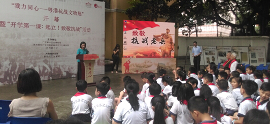 9月1日上午,廣州起義紀念館舉行了“戮力同心——粵港抗戰文物展”開幕暨“開學第一課:致敬抗戰”活動。該館與大南路小學合作,將小學開學第一堂課放到展覽開幕場地。同時,活動請來了東江縱隊老戰士、徐毅平烈士胞弟徐矛、徐耕等,通過教唱抗日歌曲等環節,讓孩子們在開學典禮之日重溫抗戰的苦難歲月,體味自強、團結、犧牲、堅韌的抗戰精神。
