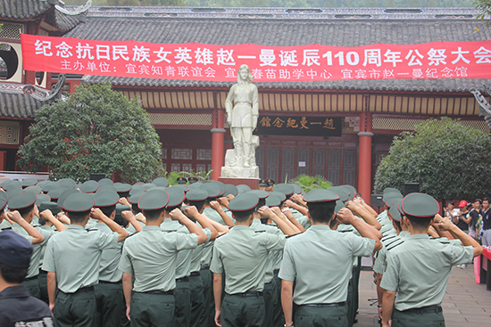 除了市民自發組織的活動以外,61902部隊的120名官兵和宜賓武警官兵也來到趙一曼紀念館進行了紀念活動。為表達保衛國家的信念和忠誠,61902部隊的政委現場作詩一首:“誓志為團不為家,長江之邊衛國家,一肩挑起千斤擔,兩腳踩在生死線。未聞戰鼓官兵急,強軍目標催人進,一年太久爭朝夕,重振旗鼓開新局。”