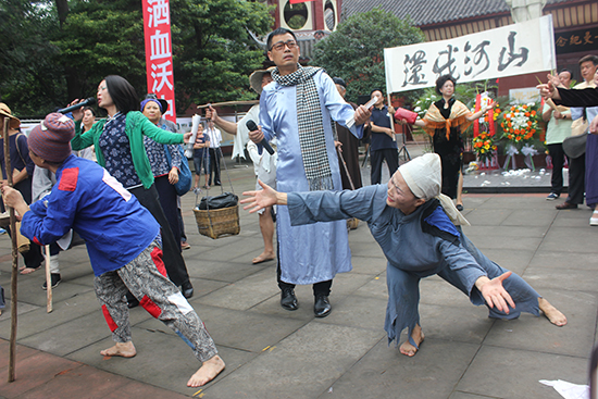 在現場節目表演中,一首《松花江上》的歌舞表演,情節震撼,牽動人心,讓現場的觀眾都忍不住流下眼淚。此外,68歲的作曲家吳華來到現場,聲情并茂地給大家演唱了他親自作曲的歌曲《歌唱英雄趙一曼》。“這首歌曲是15年以前創作的。今天我到這兒來唱這首歌,是為了表達對烈士的崇敬。趙一曼是我們宜賓人,是我們從小就知道的女英雄。我在翠屏區武廟街小學讀書時,和少先隊員一起去幫助過烈屬。趙一曼的二姐就居住在我們學校附近,記得我們當時去她家時,她給我們講過很多趙一曼的故事,所以我從小就很崇敬她。今天我唱的這首歌曲是15年以前創作的。當時,我們聽過歌唱雷鋒的歌,而沒有專門歌唱趙一曼的歌,就想創作這樣一首歌,讓大家都來傳唱,讓她深入人心。今天我到這兒來唱這首歌,也是為了表達對烈士的崇敬。”吳華說。
