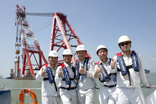 徐波向記者透露,針對大型構件的外海高精度安裝施工,在中交集團和一航局的科研立項基礎上,CB03標項目部制定了20多項施工技術科研專題,申報了40多項國家專利,用超前謀劃、細致研究、反複論證確保了技術方案的安全可靠。在低墩區整體式墩台安裝中,要將自重最大達3510t的混凝土構件整體吊裝並下放至水面以下15m,難度可見一斑,為了規避“濕法”安裝工藝可能帶來的漏水和墩台止擺難等安全質量問題,世界首創了鋼圓筒圍堰幹法施工工藝。