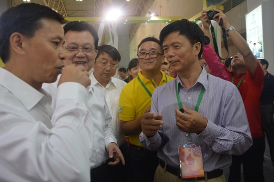 國家林業局紀檢組長陳述賢(左一)在湖南省林業廳廳長鄧三龍(左二)陪同下在湖南展廳喝湖南茶油