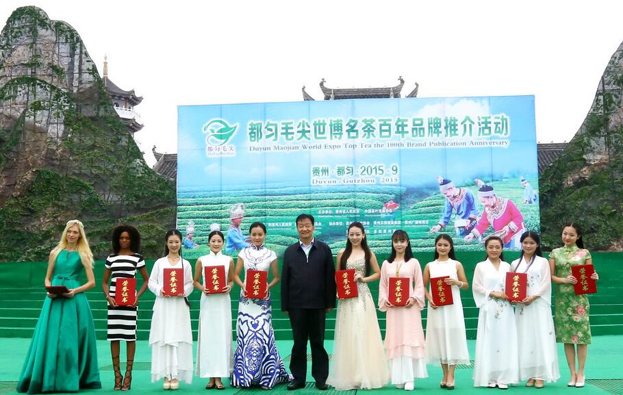 出席領導為榮獲都勻毛尖“茶仙子”的品牌代言人頒發獲獎證書.