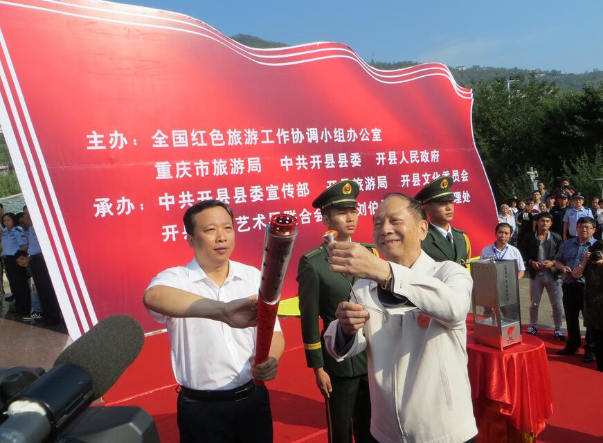 中共開縣縣委書記何毅(圖中左)接力“紅色旅游火炬”傳遞。