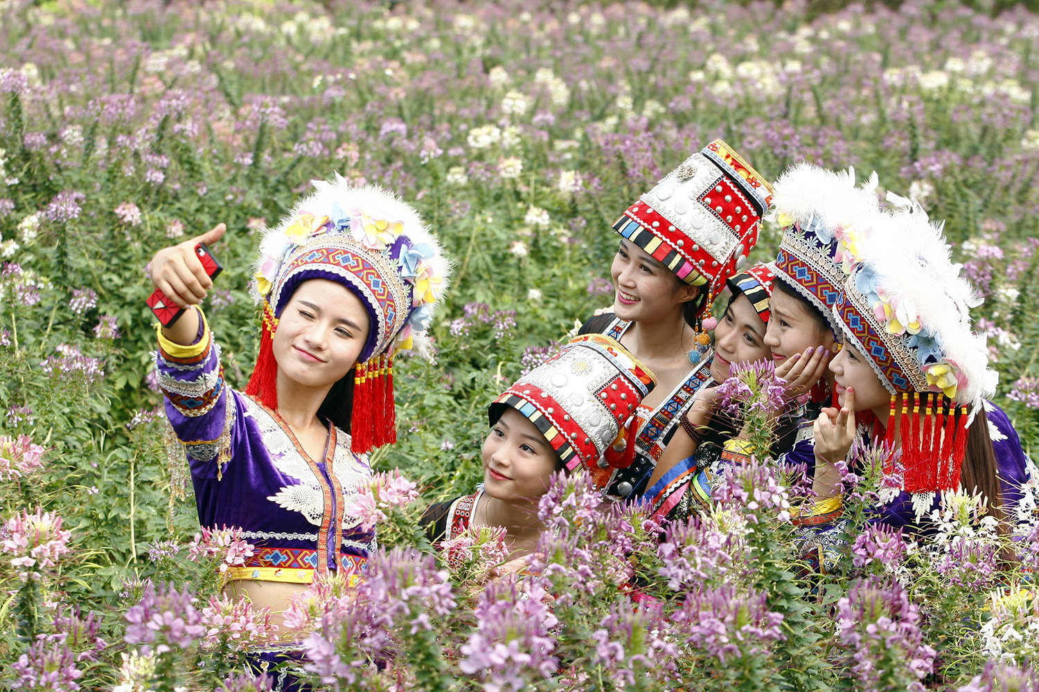 美丽的姑娘们身着高山族服饰与花海争妍。