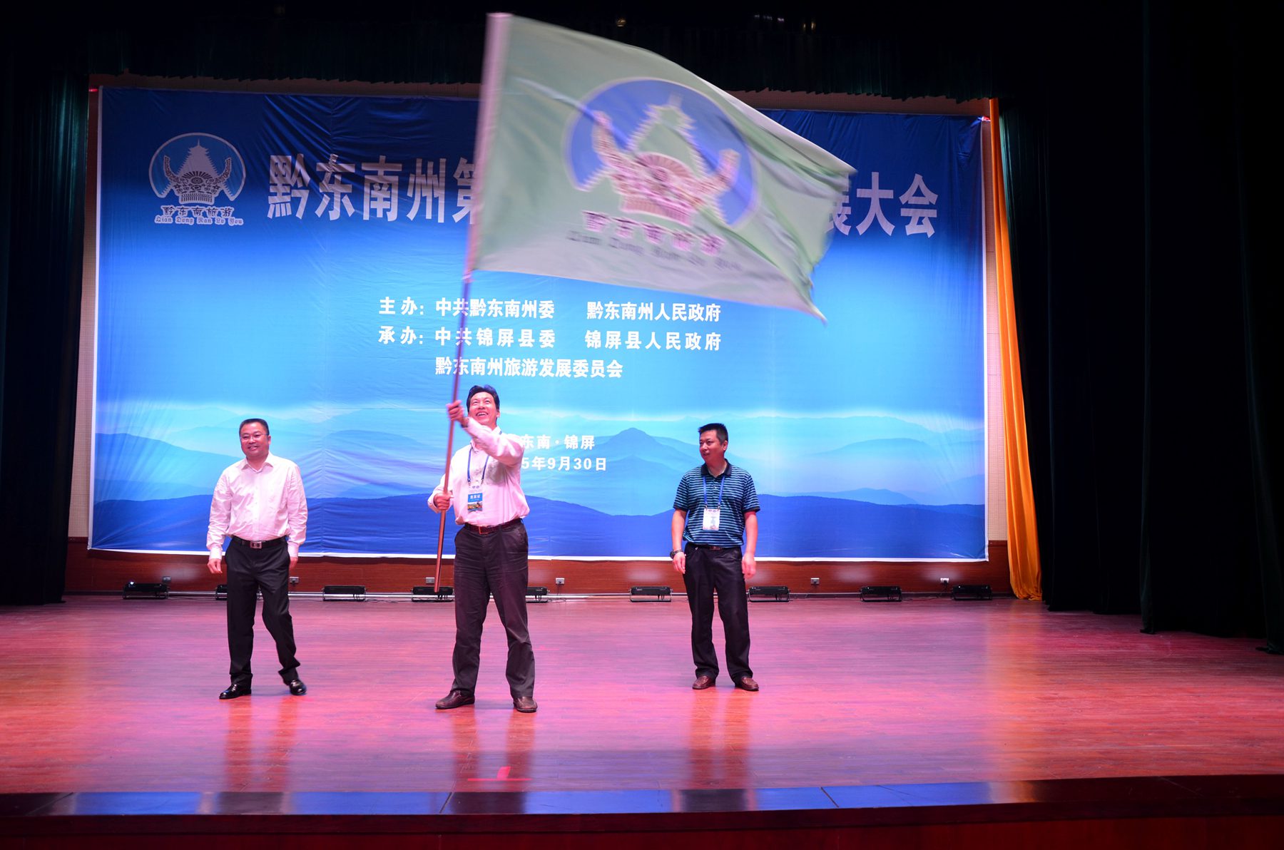 會上,出席領導將黔東南州旅游產業發展大會會旗交接給下一屆主辦地黎平縣的儀式。