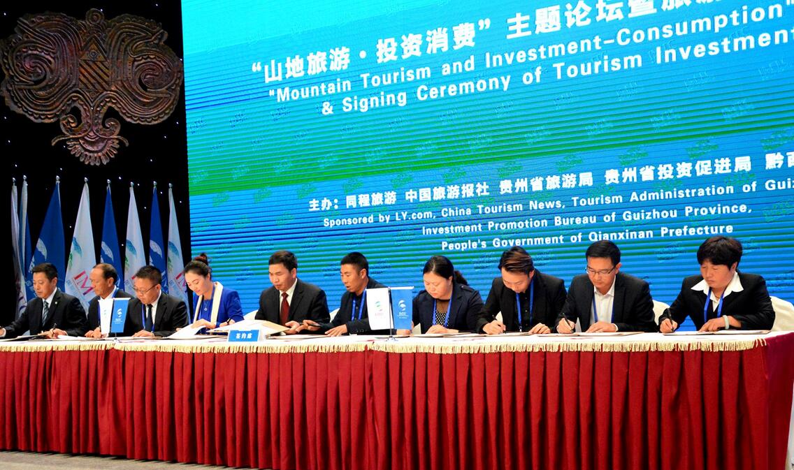 簽約儀式上,貴州省旅游局與中國工商銀行貴州分行、中國銀行貴州分行、中國光大實業(集團)有限責任公司、中國保利集團公司簽署構建貴州全域旅游服務體系戰略合作協議,簽訂貴陽中航“愛游客”蘇格蘭營地、遵義茅臺鎮·國酒文化主題演藝、六盤水大河鎮民潤休閑農業、安順秀水健康產業園等旅游投資項目。