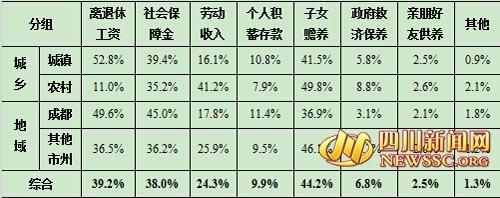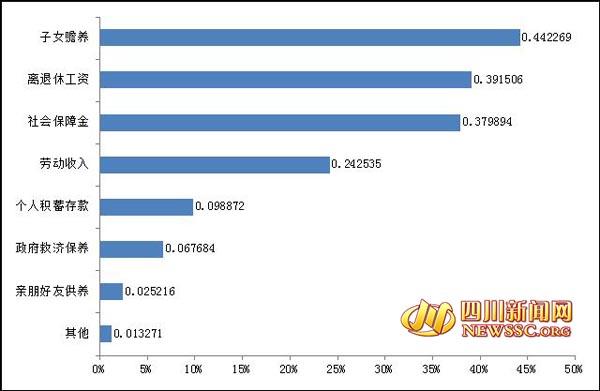 分城鄉來看,排在前三項的老人生活保障來源中,城鎮受訪者的選擇從高到低依次是“離退休工資”、“子女贍養”和“社會保障金”,而農村受訪者的選擇依次是“子女贍養”,“勞動收入”和“社會保障金”。分地域來看,成都市和其他市州排在前三項的老人生活保障來源一致,但是成都市選“離退休工資”和“社會保障金”的比例大大超過其他市州,而其他市州選“子女贍養”的比例超過成都市;其他市州受訪者中選擇“勞動收入”的比重也不少,為25.9%,較成都市受訪者高出8.1個百分點。