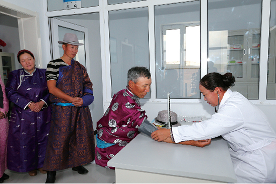 洪格爾高勒鎮阿拉坦圖古日格嘎查衛生室。醫務人員在為前來就醫的牧民量血壓。