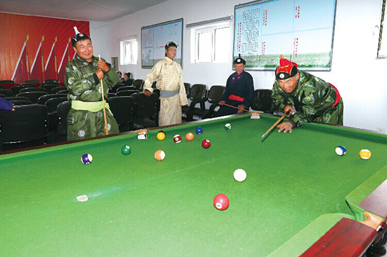 走進活動室,里面有一張臺球案,幾個年輕人正在打臺球。包錫盛說:“這里不僅是嘎查的文化活動室,我們嘎查的辦公室、閱覽室還有便民服務代辦點都設置在這。”牧民達呼爾巴雅爾說:“以前嘎查啥也沒有,條件很差,牧民想舉辦個那達慕都組織不起來,現在有了活動室,我們有地方開牧民大會了,大家也都很積極,組織個活動方便多了。5月份的時候,包大哥就幫我們組織了‘三八’‘五四’聯誼會,大家賽馬、拔河……極大地豐富了我們的生活。”