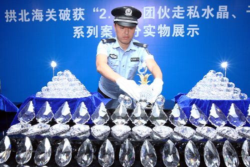 拱北海關現已查明,該團夥主要通過三個渠道進行跨關區“遊走漂移”走私活動:一是在香港以低於正常進口應繳稅額的價格,委托多家快遞公司通過快件或商務車夾藏以及偽報品名報關,將水晶走私進境;二是在香港將水晶運至越南,同樣以低於正常報關應稅額的費用,交給他人包稅進口,攬貨人則安排人員從廣西邊境將水晶走私進境;三是在香港將水晶運至北方某港口,安排人員以一般貿易渠道偽報為廉價的“玻璃制品”,迂回數千公裏將水晶走私進境。在案發時,海關緝私人員當場在廣東南沙截獲一個貨櫃的走私進境水晶。海關介紹,由於水晶從外觀上看與玻璃高度相似,未經商檢非專業人士通常難以區分,水晶珠體積小、價值高、易於藏匿,在口岸查獲難度很大。