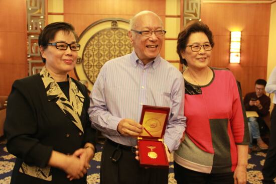 陳嘉庚先生長孫陳立人先生手捧抗戰勝利紀念章,與來自海內外的集美校友合影(陳季玉攝)