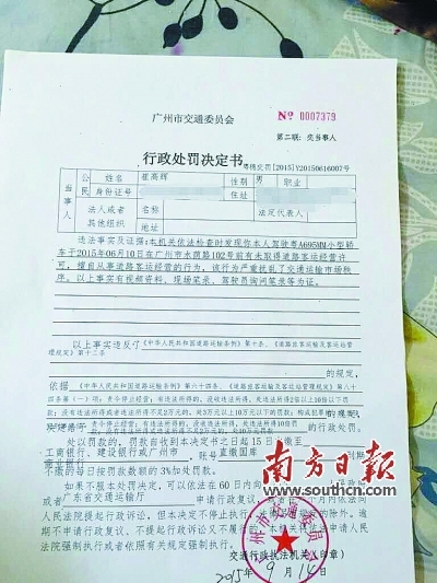 10月21日,崔先生向南方日報記者介紹,他 只做了3天專車司機就被廣州市交委查處。崔先生出示了《行政處罰決定書》,里面寫道:“違法事實及證據是‘本機關依法檢查時發現你本人駕駛××小型車于 2015年06月10日在廣州市水蔭路102號前有未取得道路客運經營許可,擅自從事道路客運經營的行為,該行為嚴重擾亂了交通運輸市場秩序,以上事實有 視頻資料、現場筆錄,駕駛員詢問筆錄為證’;以上事實違反了《中華人民共和國道路運輸條例》第十條、《道路旅客運輸及客運站管理規定》第十二條的規定,依 據《中華人民共和國道路運輸條例》第六十四條、《道路旅客運輸及客運站管理規定》第八十四條第(一)項:責令停止經營;有違法所得的,處違法所得2倍以上 10倍以下罰款;沒有違法所得或者違法所得不足2萬元的,處3萬元以上10萬元以下的罰款……”。