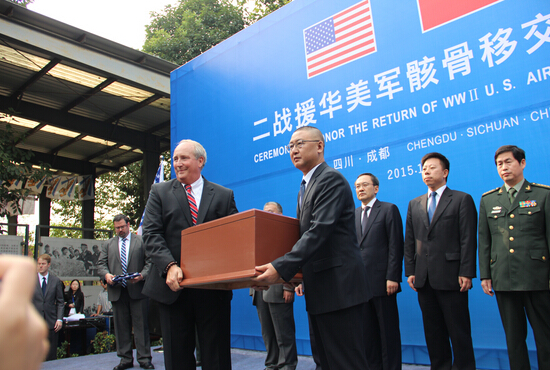 【香港商報網訊】記者 付莉莉 報道: 22日,“二戰援華美軍骸骨移交儀式”在四川成都建川博物館舉行。建川博物館館長樊建川將裝有28塊美軍遺骨的骨灰盒交到美國國防部戰俘及失蹤軍人統計署高級顧問詹姆斯手中。據悉,這是四川民間力量首次尋找到二戰美軍遺骨。