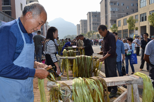 第三届夏布文化节上,农民展示“刮麻”工艺.