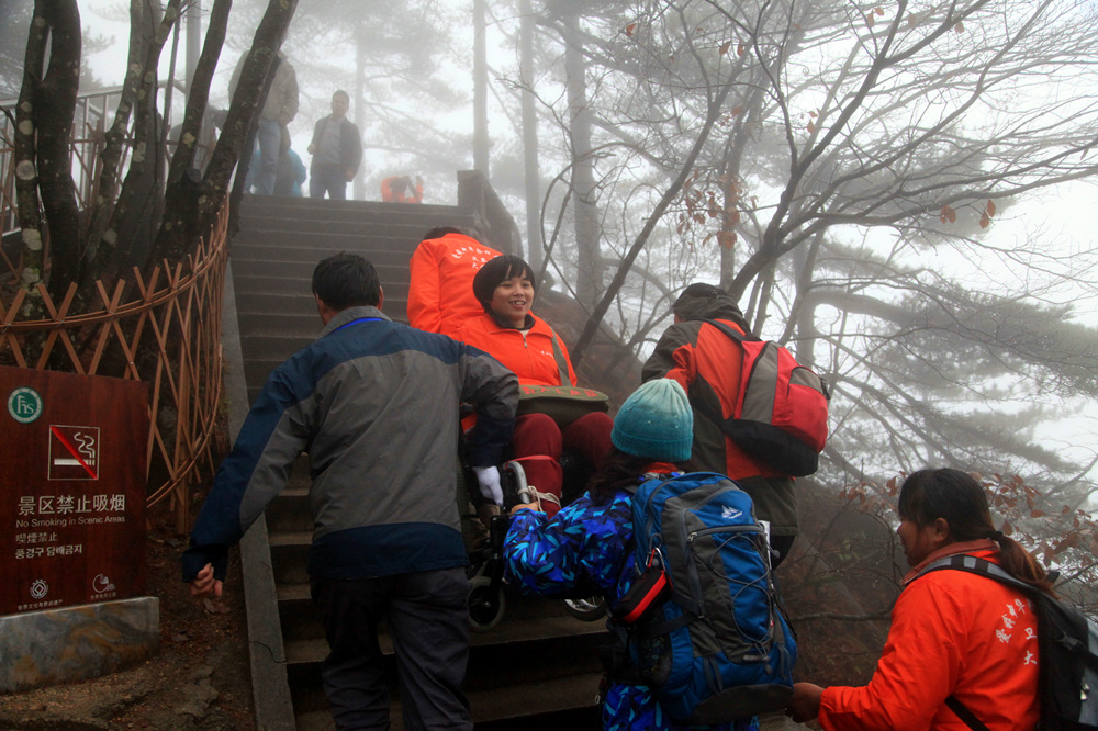 活動當天下著小雨,山上有霧,能見度不佳,程劍不停地招呼大家注意安全。他是活動的主辦人,也是黃山云海樓的樓主,作為一名胸椎癱患者,程劍曾經在床上躺了8年,一度對生活失去了信心,但當他第一次坐輪椅登上黃山,心里被震撼,重新燃起人生的希望,有了讓更多的輪友登上黃山的念頭。于是,從2006年開始,程劍幾乎每年都要舉辦一屆輪椅黃山行活動,活動得到了世界各地輪友們的積極響應和參與。今年雖然已經是第九屆,活動各個環節也都輕車熟路,但他依然親歷親為,一絲不茍。