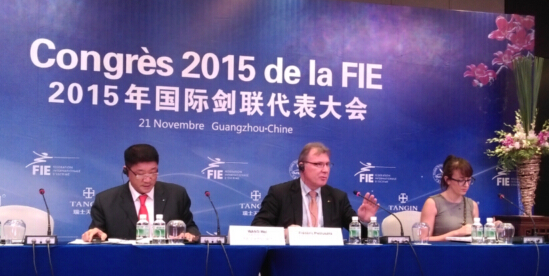 [香港商報網訊] 2015年國際劍聯代表大會于11月21日在廣州市花園酒店召開。據悉,這是中國首次舉辦國際劍聯代表大會。國際劍聯是世界擊劍運動的管理組織,目前擁有150多個國家和地區的會員協會。國際劍聯代表大會是國際劍聯最重要的年度工作會議,也是國際劍聯最高規格的大會。