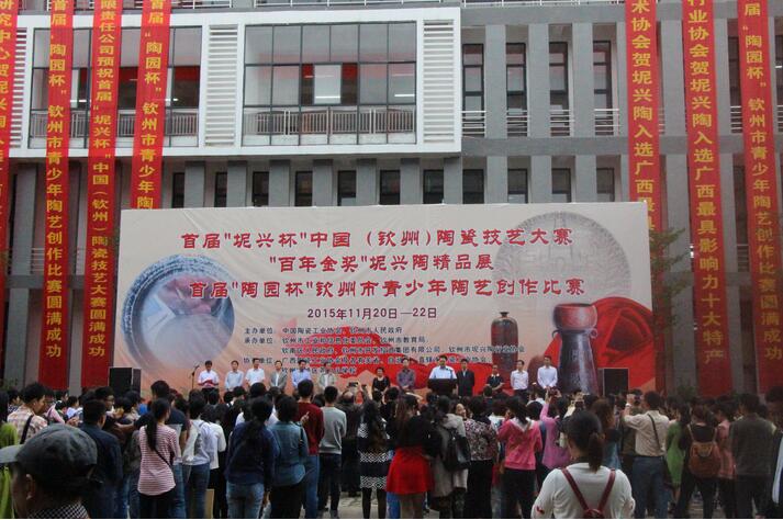 21日,2015年廣西(欽州)坭興陶“兩賽一展”活動開幕式在廣西欽州坭興陶文化創意產業園舉行,來自河北、湖南、江西、貴州等全國各地的160名陶瓷大師和愛好者參賽。