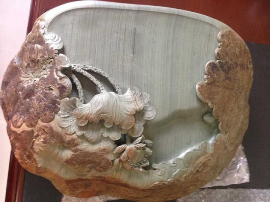 作品故事:此石原得于河里,質地光滑表面帶有黃色花紋。在荷潭里的一座小亭里,雕刻師應朋友約贈送石頭,此時正值夏日荷花盛開之際,為記念友情,成此夏日荷花硯。