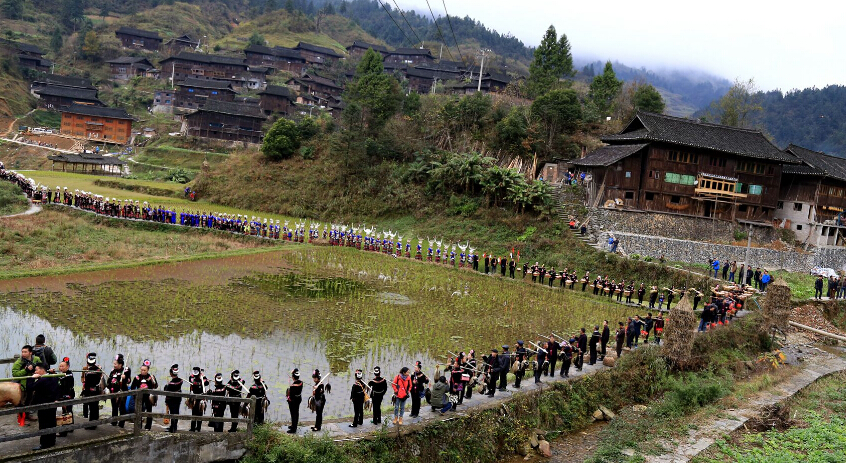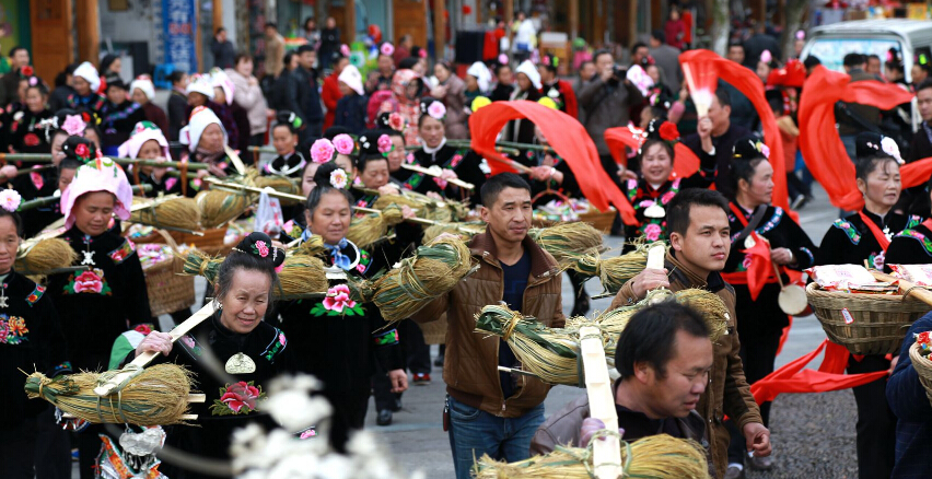 12点,所有准备工作就绪,近400人的姑妈、姑爹吹着芦笙,抬着礼物,200多米长的队伍在县城缓缓向乌东村走去。