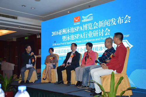 在近日举行2016亚洲泳池SPA博览会新闻发布会上,来自广东省沐浴休闲协会会长敬洪斌、广东鸿威国际会展集团总裁王登云、运水高(广州)环保设备有限公司董事长叶俊松、广州蒙娜丽莎卫浴股份有限公司董事长丁伟刚、广东爵仕泳池水疗设备有限公司总经理余小玲、深圳市建装业集团股份有限公司设计院副院长杨林等行业精英进行探讨了行业发展。