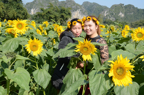 在这里,几十亩葵花迎风盛开。一朵朵硕大的金黄葵花就像一个个灿烂的小太阳,在绿色叶片的衬托下,像一张张绽开的笑脸,汇聚成碧波荡漾、金光灿灿的海洋,在这个寒冷的冬季,如此百花齐放的动人画面,让人倍感温暖。看到如此美景,游客们纷纷拿出手机、自拍杆穿进花林与花儿争秀笑颜。