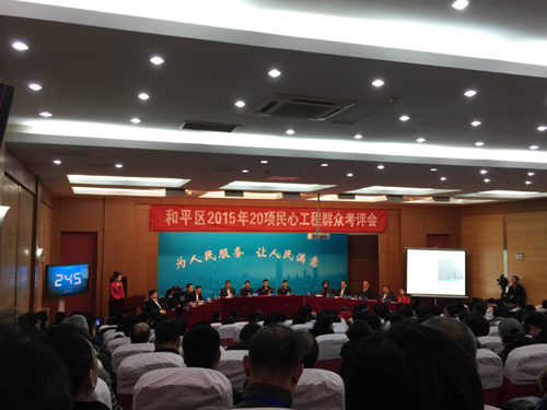 和平区的2015年20项民心工程群众考评会,即“民评官”活动,是和平区在“三严三实”专题教育活动中,坚持问题导向和问政于民,着力纠正工作中不严不实的一项创新举措。今年7月28日,和平区首次开展“民评官”活动,承担民心工程的14个重点部门向群众汇报工作,当场接受质询并予以回应,共收集到来自全区各个界别评议代表的问题和意见112条,在社会上产生了积极反响,作为这是一项转变干部作风和密切干群关系的活动,对全区干部强化宗旨意识,使民心工程真正得民心顺民意起到有力推动作用。