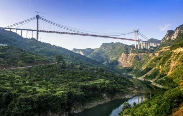 在大桥施工中,施工方克服了桥面到谷底达400多米的高差,在地势险要的两岸逐步推进,其索塔位置距离悬崖边缘仅50至60米,场地十分狭小。加之地质复杂,大桥存在岩堆、岩溶、裂隙等诸多不良地质条件下,在施工中主塔的每个承台下面架设了9根直径3.5米、最长长度72米的人工挖孔桩,穿越了很多复杂的地质和溶洞;吊装过程中,曾运用了单件最大吊装重量达200吨的钢桁梁组拼方式,将大桥钢梁施工平行运送距离1000多米,施工难度及安全风险都非常高。