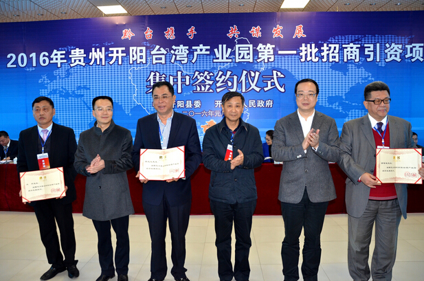 【香港商報網訊】記者 黃慶松 報道:1月8日,貴州省貴陽市開陽縣舉行的2016年貴州開陽臺灣產業園第一批招商引資項目集中簽約儀式上,該縣人民政府與20家臺資企業簽訂了招商代理協議、項目咨詢合作協議、項目投資協議,簽約總金額達55.3億元。