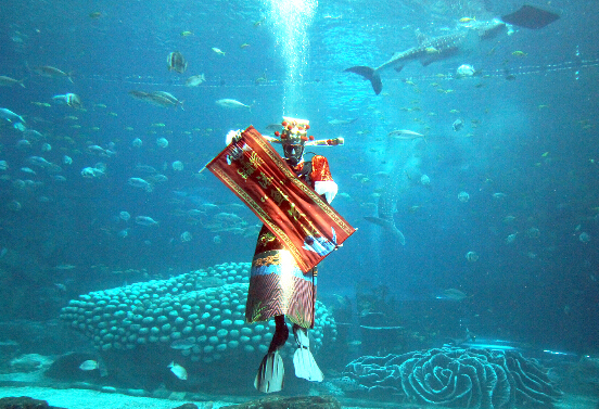 “財神”在“海底”為游客和鯨鯊們送上祝福