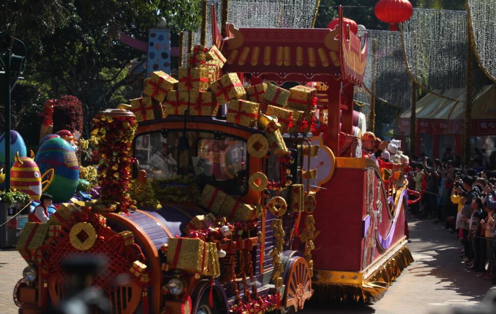 記者在長隆歡樂世界“春晚花車大巡遊”的隊伍中還看到,已經在春節檔期形成傳統的長隆歡樂世界大巡遊,不僅有萬眾矚目的央視春晚花車,還有精彩的演藝。來自多個國家的演藝精英打扮成東方節慶的模樣,身著喜慶唐裝,為觀看花車巡遊的遊客送來“零距離”的祝福。於此同時,被稱為廣州開放最早、持續時間最長的長隆歡樂世界的新春花市也獲得了全國各地、包括外國遊客的青睞,人潮不斷湧向花市所在的中心演藝廣場。