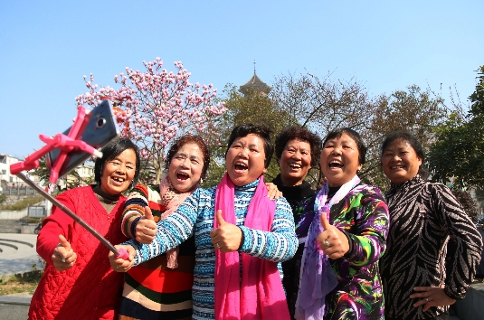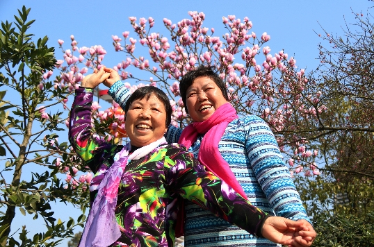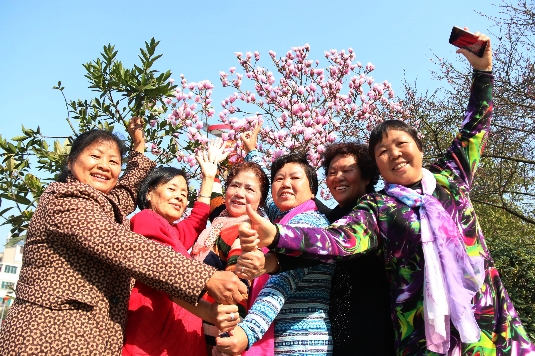 2016年3月1日,市民在貴州黔東南黎平縣城中文化廣場與盛開的白玉蘭合影