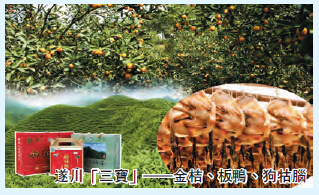 遂川著名的地方特產有「三寶」——金桔、板鴨、狗牯腦,再加上當地盛產的油茶、井岡蜜柚和毛竹,構成了生態優勢十分明顯的產業帶與觀光帶。目前,全縣的茶葉種植面積共20萬畝,金桔種植13萬畝,井岡蜜柚種植3萬畝,油茶種植68萬畝,板鴨年加工可達800萬隻,已註冊的生態旅游基地(生態農莊、家庭農場等)320餘家。特別值得一提的是「三寶」中的狗牯腦茶葉,被列為全省重點整合的「四綠一紅」五大茶葉發展品牌之首,成為江西茶葉第一品牌,榮獲「最具品牌發展力品牌」稱號,遂川也被評為「中國茶葉發展示範縣」。在發展金桔產業方面,該縣正在與華南醫學院研發金桔口服液,同時積極開發金桔系列產品,延伸金桔產業鏈。在禾源、巾石、南江等鄉鎮大力發展油茶產業,推進高產油茶的新造和低改,扶助新大地生物科技等油茶加工企業做大做強。