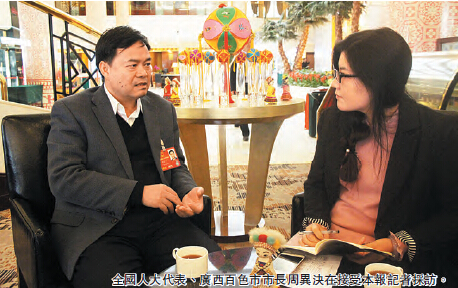 周异決說,為落實好總書記的重要講話精神,面對發展基礎薄、經濟總量小、貧困人口多和經濟持續下行帶來的重重壓力,百色市堅決貫徹落實中央穩增長、促改革、調結構、惠民生、防風險的決策部署,保持了經濟持續健康發展的良好勢頭。2015年,全市地區生產總值980億元,增長8.1%;固定資產投資突破千億元大關,達1022億元,增長14.2%;財政收入114.5億元,增長5.4%;城鎮居民可支配收入24958元,增長7.2%;農民人均純收入6766元,增長10.1%,全區排位第二。完成51.3萬戶精準扶貧識別工作,減貧17.5萬人。并先后創建成為「中國優秀旅游城市」「全國雙擁模範城」「國家園林城市」「國家衛生城市」,老區面貌發生巨大變化。