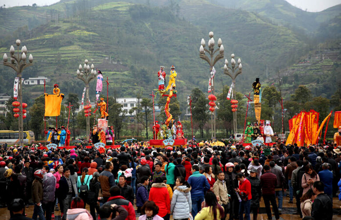 上午10時,參加巡游的“大壩高裝”、苗族風情舞蹈、舞龍燈、川劇絕技等一個個頗具地方特色和苗族風情的藝術精品,紛紛走上街頭,興文縣城沉浸在歡天喜地的節日氛圍中。
