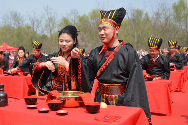 許下愛的承諾,駛向幸福港灣。32對新人3月20日上午在合肥廬陽區三國新城遺址公園,參加了第三屆合肥青年集體婚禮暨秦漢新婚大典,演繹了穿越時空的千年愛戀。莊重的盛世鼓舞,啟動了婚禮大典,32對新人身著秦式婚服,以秦式禮儀的步伐入場。在禮官的帶領下,新人首先互揖行禮,而後新婦卻扇,新人行沃盥禮、同牢禮、合巹禮、解纓結發禮……整套禮儀逐一演繹,讓新人充分體驗秦漢禮儀。